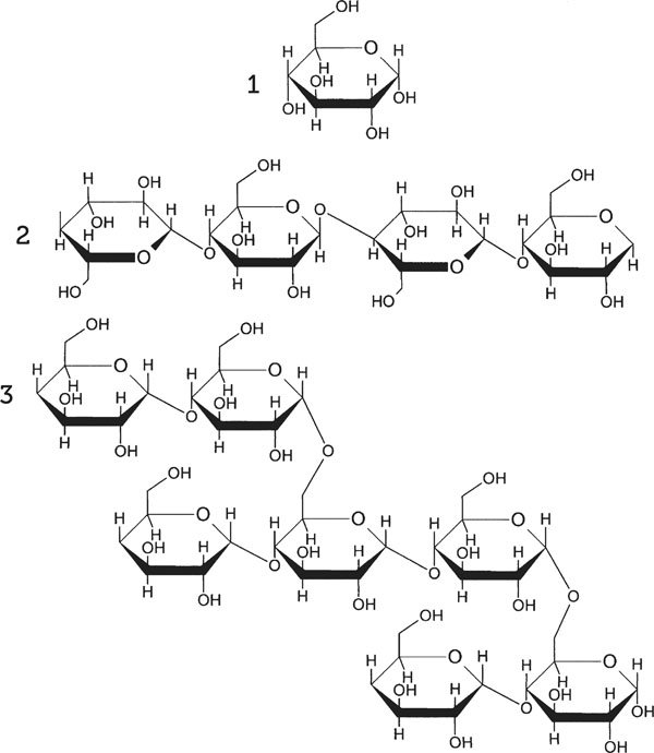 Углеводы: 1 – глюкоза; 2 – простая цепочка молекул глюкозы; 3 – цепочки глюкозы, соединенные водородными связями (целлюлоза)