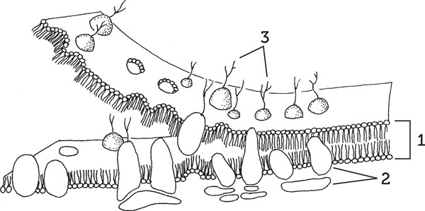 Клеточная мембрана: 1 – двойной слой фосфолипидов; 2 – белки; 3 – углеводы, связанные с белками