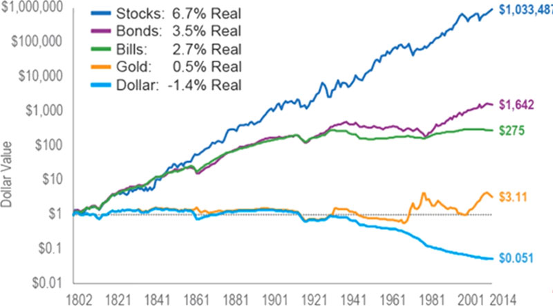 На иллюстрации выше можно увидеть на сколько доходность различных активов превышает величину инфляции на основе данных по рынку США за более чем 200 лет наблюдений. Статистические данные брались с учетом реинвестирования купонов по облигациям и дивидендов по акциям, то есть они показывают полную доходность различных групп активов.