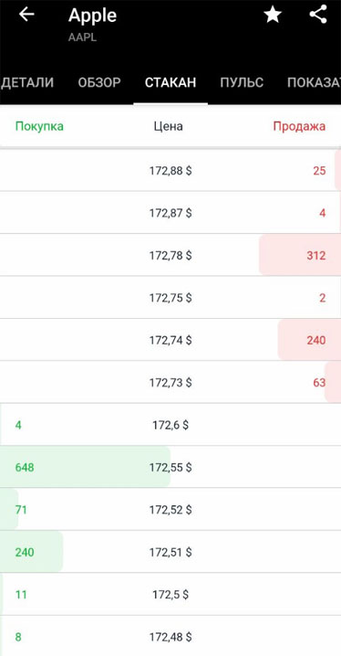 Наглядно стакан можно увидеть в торговом терминале. Кроме этого, многие брокеры включили данный инструмент и в свои мобильные приложения.