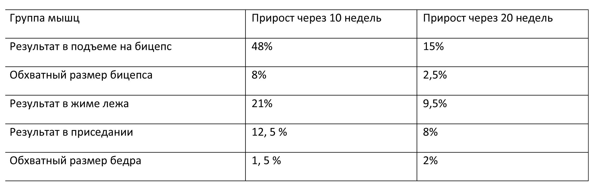 Одной из главных задач начальной системы является выявление индивидуальных возможностей атлета, таких, как тип телосложения, качество мышц, соответствие психики требованиям бодибилдинга, работоспособность, функциональные показатели, скорость восстановления организма. На начальном этапе тренировки для каждого спортсмена важно знать, как соотносятся темп его индивидуального роста со среднестатистическими. Для этого приведу некоторые данные: