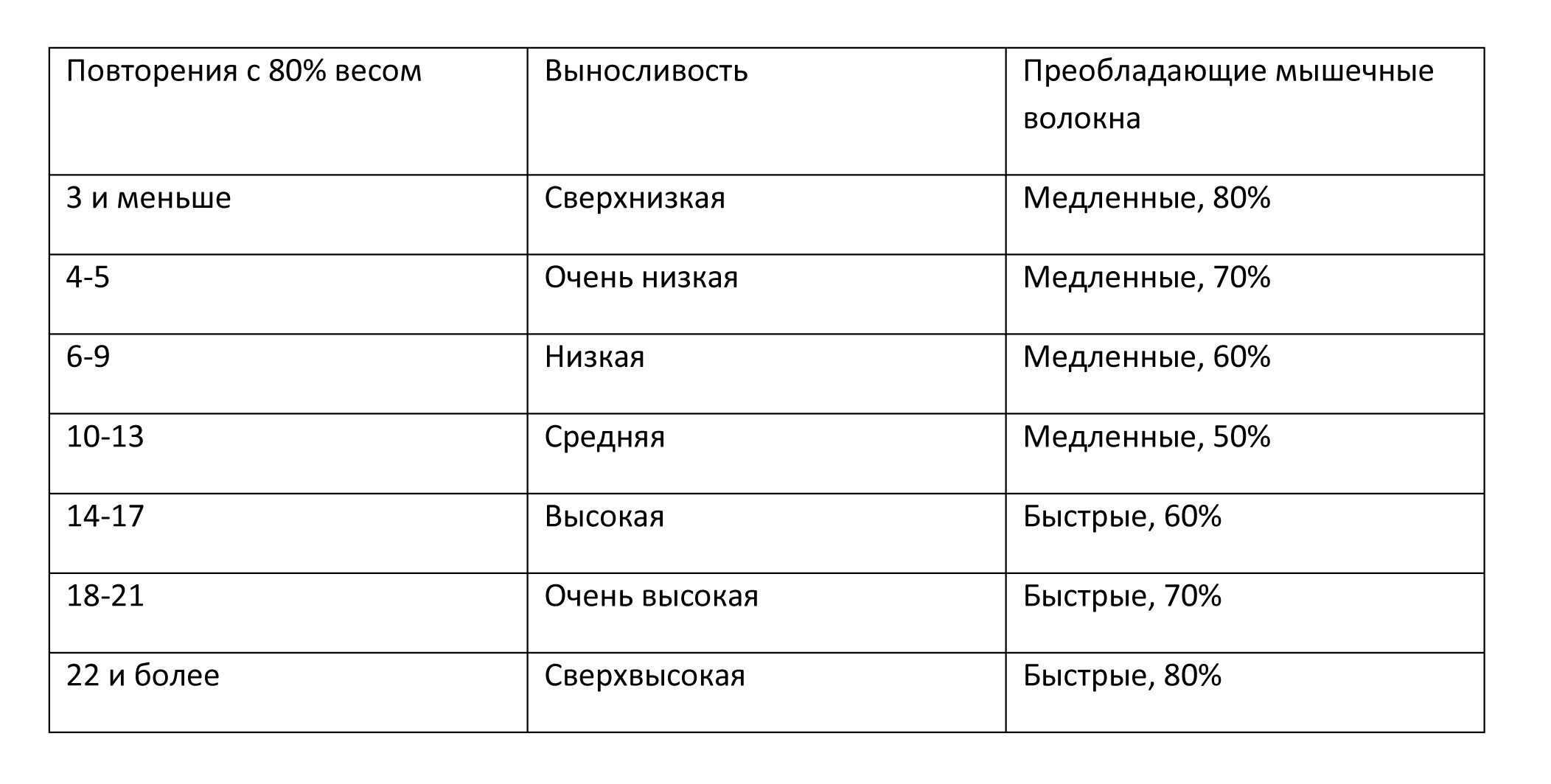 Анализируя приведенные ниже таблицы, можно определить оптимальную тренировочную нагрузку. Для эффективной тренировки, в которых преобладают быстрые волокна, рекомендую 3-5 сетов по 4-8 повторений.