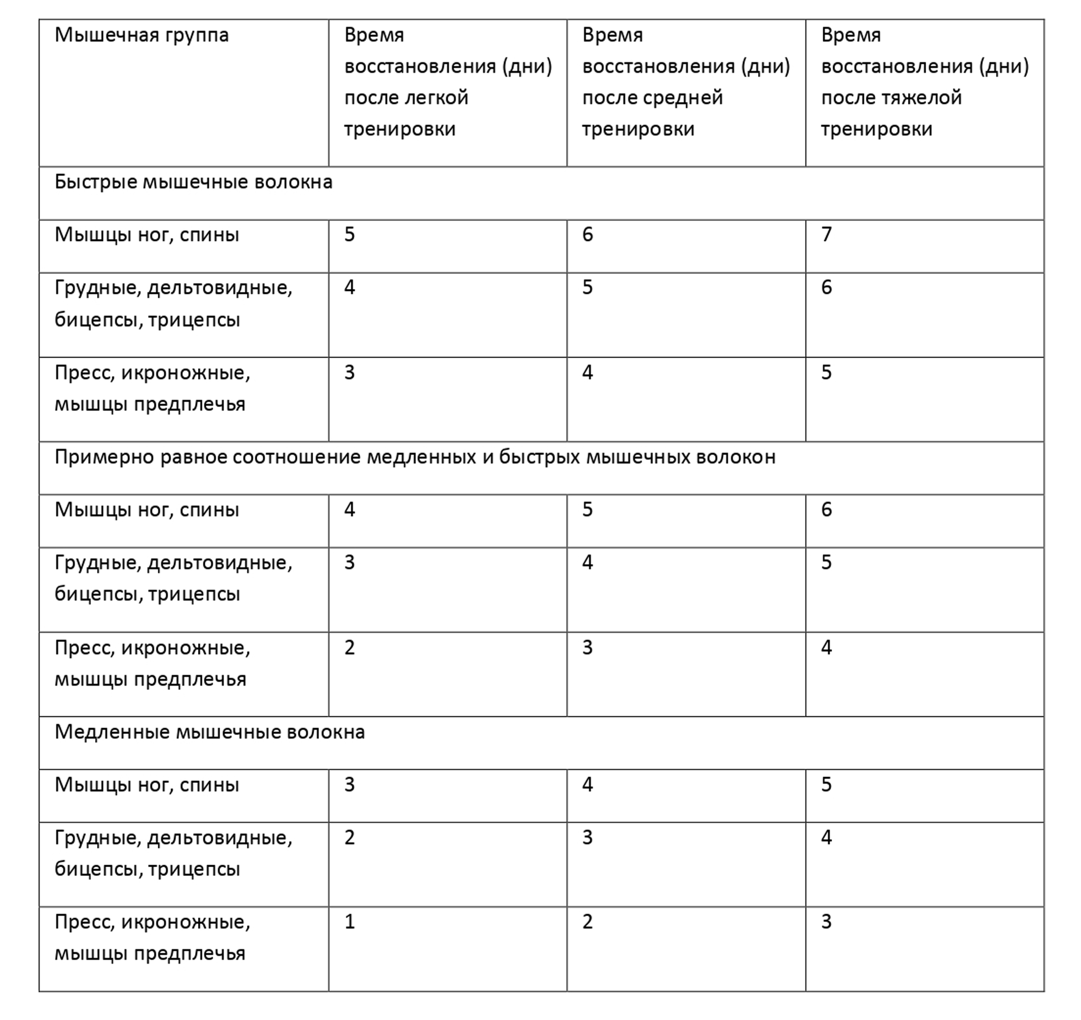 После определения типа мышечных волокон для начинающего атлета будет полезно знать время восстановления основных мышечных групп.