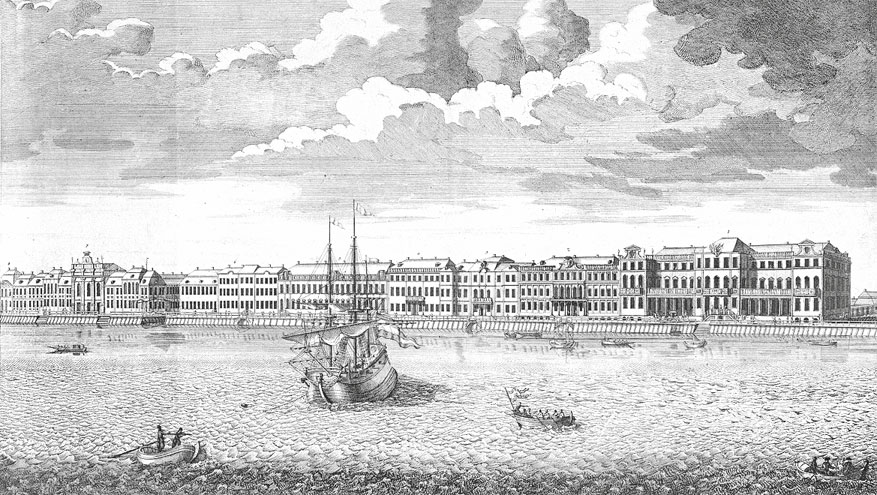 Дворцовая набережная к кон. 1720-х гг. Деталь гравюры О. Эллигера (1728–1729 гг.) по рис. Х. Марселиуса (сер. 1720-х гг.)