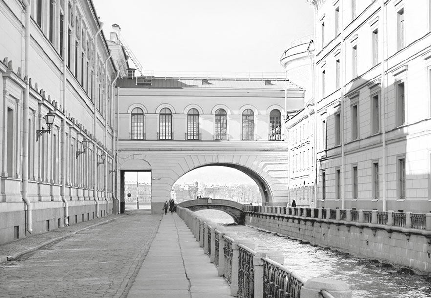 Прогулку мы начнем с эрмитажного мостика через Зимнюю канавку, вдоль нее выйдем на Миллионную улицу, свернем направо и, миновав Атлантов, окажемся на Дворцовой площади.