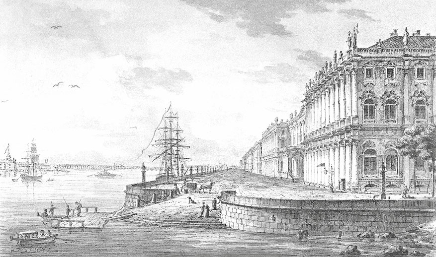 А к концу 1761 г. вчерне закончили строительство уже нового, 5-го Зимнего дворца, по проекту Ф. Растрелли. Старая деревянная набережная на фоне дворца выглядела непрезентабельно, и в июне 1762 г. специальным указом Екатерины II коллежскому советнику архитектору Игнацио Росси поручено оставить проект новой, каменной набережной: «Здесь, в Санкт-Петербурге, против всех наших дворцов, садов и казенных домов берега зделать каменные».