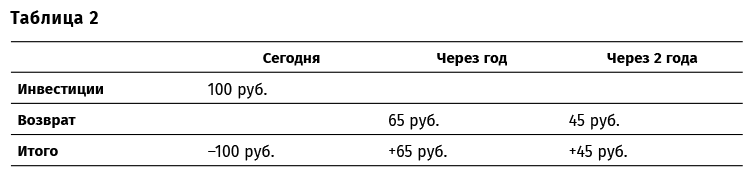 Предположим, что с учетом риска проекта инвесторы готовы вложить в него деньги под 10 % годовых. В этом случае в конце первого года общий долг компании перед инвесторами составит 100 + 100 × 10 % = 110 руб. Из них 80 руб. вернутся инвесторам. В проекте после первого года из инвесторских денег останется 110 – 80 = 30 руб. В течение второго года инвесторы потребуют на них 30 × 10 % = 3 руб. процентов, то есть общий долг составит 30 + 3 = 33 руб. Из проекта в конце второго года инвесторам вернется 45 руб., то есть они получат на свои деньги не только требуемый процент возврата, но и дополнительный доход в 45 – 33 = 12 руб. сверх того! На таких условиях деньги в проект вкладывать можно и нужно.