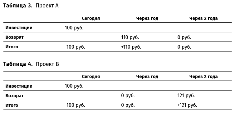 Сделаем следующий шаг. Предположим, у нас есть два одинаковых по риску проекта, в которых требуемый инвестором возврат составляет 10 % годовых (табл. 3, 4).