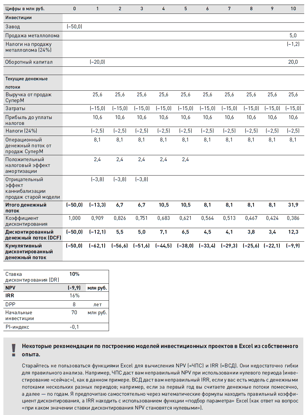 Итак, мы видим, что проект СуперМ имеет положительный NPV в 20 млн руб. Начальные инвестиции проекта равны 70 млн руб. (50 млн на завод + 20 млн оборотный капитал), что дает PI индекс в 20 / 70=0,3. IRR проекта равен 16 %, DPP – около 8 лет. Какие выводы можно сделать из этих цифр?