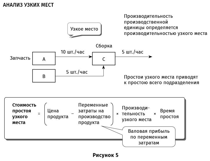 Производительность участка в целом действительно определяется производительностью его узкого места. На рис. 5 общая производительность участка будет составлять 5 единиц в час, даже несмотря на то что станок А может производить 10 единиц продукта в час. В этом случае «расшивка» узкого места помогает увеличить общий выпуск продукции. Если мы увеличим производительность станка В на одну единицу, производство в целом сможет выпускать 6 единиц продукции в час. Как в этом случае посчитать экономический эффект расшивки? Он будет равен прибыли, которую получит компания от производства дополнительной единицы продукции. Чаще всего при увеличении производительности узкого места на небольшой процент производство дополнительных единиц продукции не потребует от вас увеличения издержек, кроме затрат на материалы и переменных затрат на энергоресурсы. Таким образом, экономический эффект расшивки узкого места будет равен маржинальной прибыли от продажи дополнительной продукции.