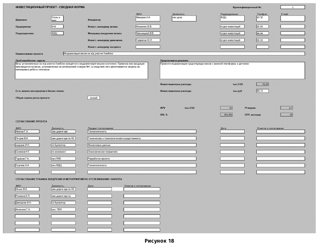 ● В форме согласования инвестиционного проекта необходимо всегда указывать предмет согласования. Замечания соответствующего подразделения не должны выходить за рамки предмета согласования. В противном случае на согласование проекта будет уходить безумное количество времени. Каждый менеджер должен отвечать за свою область работы, поэтому, например, финансовая служба не должна давать замечания по техническим решениям проекта – это дело технических служб. Технические службы не должны давать замечания по стоимости инвестиций – это дело закупочной службы и т. д. Такой подход – нормальное применение механизма управленческой дисциплины, который упорядочивает работу любой компании. К сожалению, этот подход не всегда работает на практике, но к его выполнению надо стремиться (через принятие соответствующих регламентирующих документов, через изменение культуры организации и т. д.). Кроме того, наличие предмета согласования, прямо указанного в инвестиционной форме рядом с подписью менеджера и его ФИО, дает человеку возможность четко понять, за что именно он подписывается (рис. 18). В противном случае впоследствии могут возникать недоразумения, когда человек отказывается от согласования, потому что «думал, что подписывается за другое».