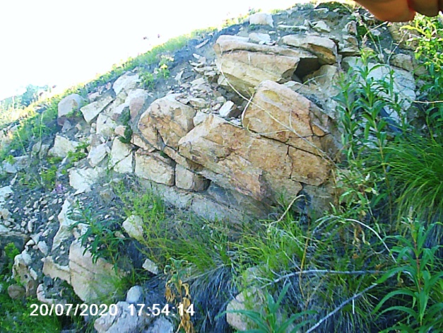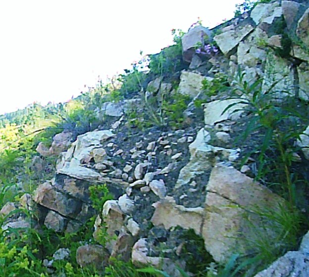 Итак, на северном склоне горы у поселка Забайкальский находятся как отдельные полуобработанные камни крупных размеров и отёсаные блоки (примерно 1 метр длиной), так и разрозненные остатки каменной кладки небольших размеров.