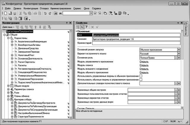 Что касается режима «Конфигуратор» (рис. 1.2), то он предназначен для настройки и администрирования программы. Здесь создаются и редактируются объекты конфигурации, настраиваются интерфейсы и диалоговые окна, определяется вид и содержимое печатной формы документов, а также выполняются иные действия по настройке и конфигурированию системы. В большинстве случаев с «Конфигуратором» работает администратор либо другой уполномоченный специалист, поскольку это требует специфических знаний.