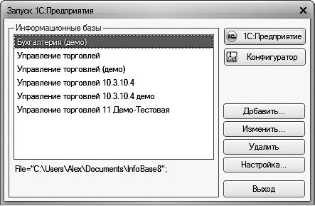 В центральной части окна запуска программы представлен список информационных баз. При первом запуске программы в данном списке может присутствовать информационная база с демонстрационной конфигурацией; эта база входит в комплект поставки и предназначена для предварительного знакомства с системой. Выбор информационной базы осуществляется щелчком кнопкой мыши на соответствующей позиции списка. Вы можете добавлять в список новые либо редактировать и удалять имеющиеся информационные базы (о том, как это делать, будет рассказано ниже).