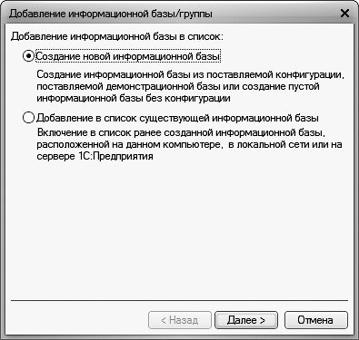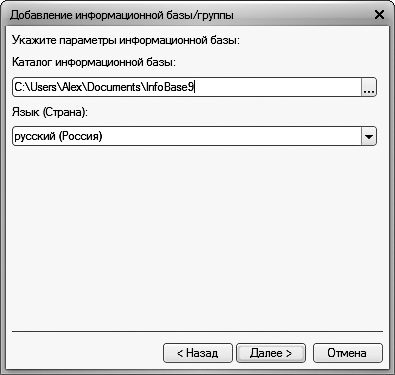 Для перехода к следующему этапу нажмите кнопку Далее. При создании новой информационной базы на экране отобразится окно, которое показано на рис. 1.6.