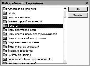 Выбор объектов для дальнейшей работы осуществляется в интерфейсах выбора или списка. Например, для перехода в режим работы с каким-либо справочником необходимо выбрать его в окне выбора (рис. 1.11), которое вызывается на экран с помощью команды главного меню Операции►Справочники.