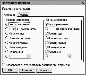 На рис. 1.13 видно, что данное окно состоит из двух вкладок: Интервал и Период. На вкладке Интервал указывается начало и конец интервала времени (иначе говоря – тип периода времени), а на вкладке Период – конкретные временные рамки. Например, если на вкладке Интервал установлены значения Начало года и Конец года, то по умолчанию в качестве условия фильтра будет приниматься текущий год; однако на вкладке Период можно выбрать не текущий, а, например, прошлый либо позапрошлый год. Аналогичным образом устанавливается фильтр по какому-либо кварталу, месяцу, неделе либо дню. Реализована также возможность ввода произвольного периода. Если установлен флажок Использовать эту настройку периода при открытии, то установленный фильтр на отображаемые данные будет автоматически применяться при каждом последующем открытии данного окна.
