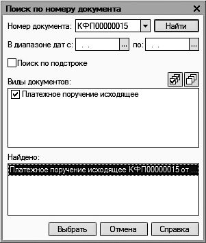 Поиск по номеру – эту команду рекомендуется использовать при работе с большим количеством документов. Она предназначена для быстрого поиска требуемого документа по его номеру в заданном интервале времени (отмечу, что интервал времени можно и не задавать – в этом случае поиск будет вестись только по номеру документа). При выполнении данной команды на экране отображается окно, показанное на рис. 1.14.