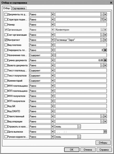 На вкладке Отбор осуществляется настройка параметров фильтра. В левой части вкладки содержится перечень условий фильтра (Номер, Организация, Вид операции и др.). Для выбора требуемого условия необходимо установить соответствующий флажок. Справа с клавиатуры либо помощью кнопки выбора указывается конкретное значение фильтра: например, на рис. 1.15 выбран фильтр Контрагент, а значение фильтра – Гостиница «Заря». Между условием фильтра и его значением из раскрывающегося списка следует задать вариант применения фильтра (Равно, Не равно, В списке, Не в списке и др. – у разных условий фильтра различные варианты применения). Например, на рис. 1.15 для фильтра Контрагент указан вариант Равно. Это означает, что после применения фильтра в списке останутся только документы, которые оформлены с контрагентом Гостиница «Заря». Если же установить вариант Не равно, то из списка будут исключены все документы, оформленные от имени контрагента Гостиница «Заря» (попросту говоря, с помощью варианта Не равно включается обратный фильтр).