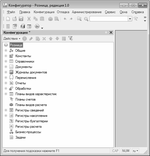 Первое, что нужно сделать в данном режиме, – это выполнить команду главного меню Конфигурация → Открыть конфигурацию. В результате в левой части интерфейса откроется окно Конфигурация (рис. 1.7).