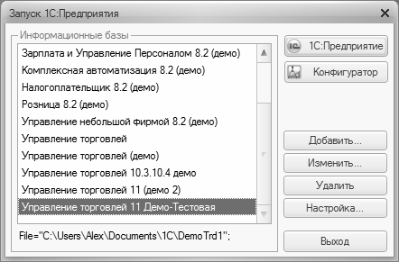 Список информационных баз формируется в центральной части окна. В данном списке может присутствовать информационная база с демонстрационной конфигурацией; эта база входит в комплект поставки и предназначена для предварительного знакомства с программой. Выбор информационной базы осуществляется щелчком мыши на соответствующей позиции списка. Вы можете добавлять в список новые либо редактировать и удалять имеющиеся информационные базы – для этого предназначены соответствующе кнопки в правой части окна.
