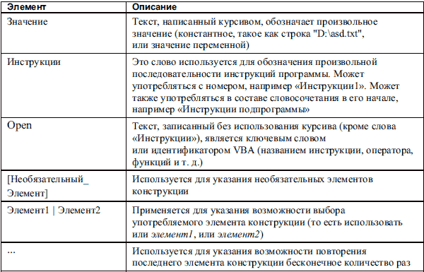 Таблица 1.1. Элементы описания синтаксических конструкций VBA