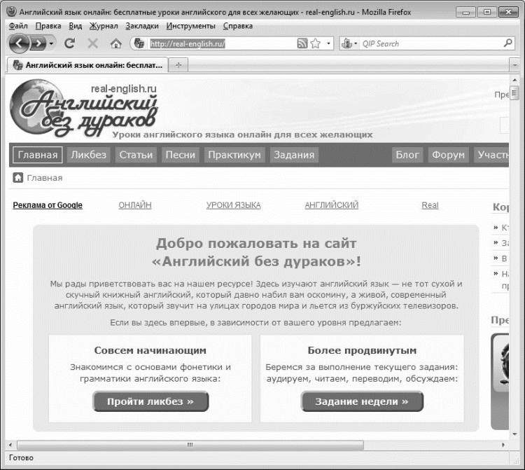 Для изучения английского языка можно воспользоваться сайтом, расположенным по адресу http://real-english.ru (рис. 1.2).