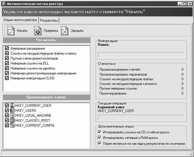 Для того чтобы приступить к чистке реестра, следует нажать кнопку Чистка реестра (см. рис. 1.1). В результате на экране откроется окно, изображенное на рис. 1.2.