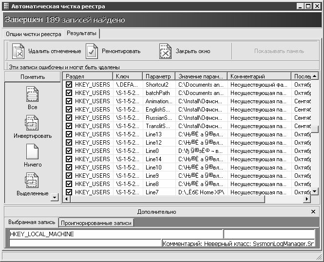 По умолчанию все позиции списка помечены с помощью флажков, установленных слева от каждой позиции. При нажатии кнопки Удалить отмеченные, которая также находится в инструментальной панели, из системного реестра будут удалены все отмеченные в списке записи. При необходимости можно выполнить выборочное удаление ошибочных записей из реестра.
