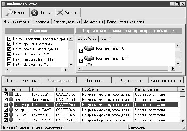 На вкладке Что и где искать в поле Действие путем установки соответствующих флажков выбираются типы объектов, которые нужно найти (временные файлы, файлы нулевой длины и т. п.). В расположенном правее поле Устройства или папки, в которых производить поиск определяются диски и папки компьютера, в которых будет произведен поиск (диски выбираются с помощью соответствующих флажков на вкладке Устройства, список папок формируется на вкладке Папки).