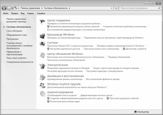 Элементы категории Система и безопасность предназначены для просмотра и редактирования параметров безопасности системы, просмотра сведений о системе и характеристиках компьютера, архивирования данных, перехода в режим работы с встроенным брандмауэром Windows, настройки параметров электропитания, выполнения действий по администрированию, обслуживанию и обновлению системы.