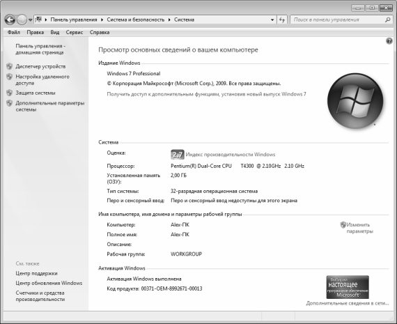 Это и есть окно, в котором можно просмотреть основные свойства операционной системы и некоторые параметры компьютера. В верхней части окна указано, что на компьютере эксплуатируется операционная система Windows 7 от разработчика Microsoft, выпущенная в 2009 году. Далее следует краткая оценка производительности системы (на данном рисунке она составляет 2,7, а о том, как просмотреть более подробные параметры производительности, будет рассказано в следующем разделе). После этого представлены сведения о процессоре и об объеме оперативного запоминающего устройства (оперативной памяти или, попросту говоря, «оперативки») – в данном случае он составляет 2 Гб. Также указан тип операционной системы – на данном компьютере эксплуатируется 32–разрядная операционная система, а еще – сведения о том, что для используемого экрана недоступны перо и сенсорный ввод данных.