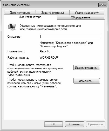 Рис. 1.4. Окно редактирования свойств системы, вкладка Имя компьютера