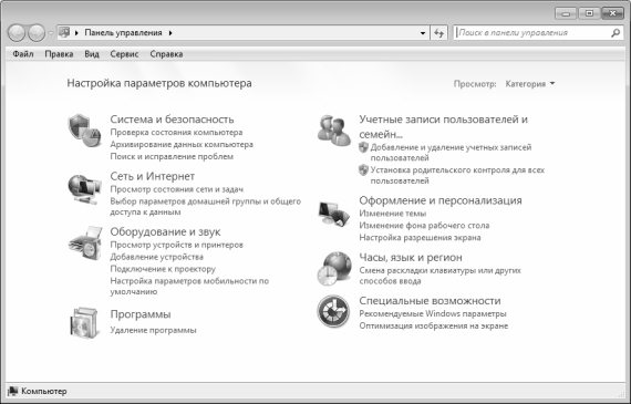 Содержимое панели управления в зависимости от функционального назначения сгруппировано по категориям, для открытия которых предназначены соответствующие ссылки (см. рис. 2.1). Отметим, что с помощью ссылок вы можете не только открыть категорию, но и перейти непосредственно к одному из ее элементов. Кратко рассмотрим основные категории панели управления и входящие в их состав элементы.