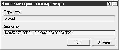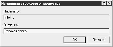 С помощью системного реестра можно изменить текст всплывающей подсказки, которая отображается на экране при подведении указателя мыши к значку Мои документы на рабочем столе. Для этого следует в разделе реестра HKEY_CLASSES_ROOT\CLSID\{450D8FBA AD25–11D0–98A8–0800361B1103} изменить значение строкового параметра InfoTip. В окне редактирования, открываемом при активизации локальной функции Изменить, необходимо с клавиатуры ввести требуемый текст (например, Рабочая папка), см. рис. 2.1, и нажать кнопку ОК.