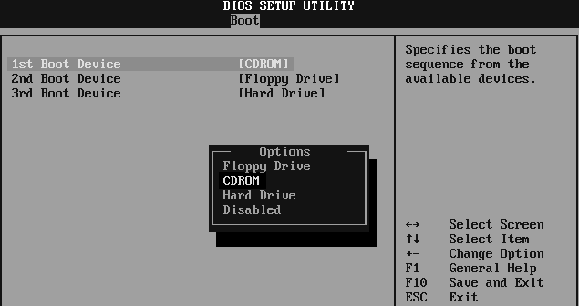 После выполнения указанных действий и сохранения внесенных изменений компьютер будет загружаться с компакт-диска (предварительно загрузочный диск должен быть установлен в CD-привод).