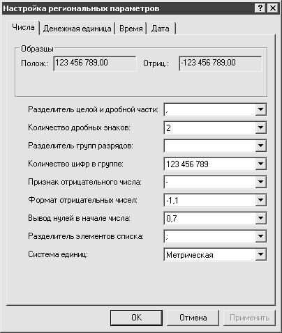 Данное окно состоит из четырех вкладок: Числа, Денежная единица, Время и Дата. Кратко рассмотрим содержимое каждой вкладки.