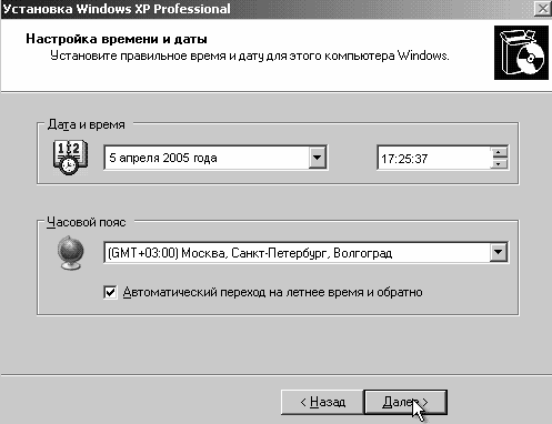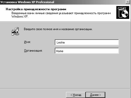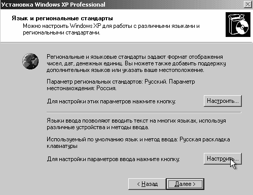 На этом настройка языков и региональных стандартов завершается, и поэтому в окне, изображенном на рис. 1.9, нажимаем кнопку Далее для перехода к следующему этапу установки Windows XP.