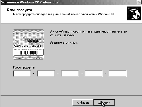В данном окне в группе полей Ключ продукта следует с клавиатуры ввести уникальный ключ, подтверждающий законность приобретения данной копии Windows XP. Этот ключ представляет собой набор из цифр и латинских букв; найти его можно в нижней части сертификата подлинности, который поставляется вместе с данной копией Windows XP. После ввода ключа нажимаем кнопку Далее.
