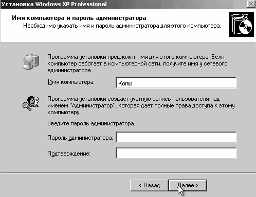 Пароль администратора особенно важен при первом входе в систему – для этого его и нужно запомнить. В дальнейшем его можно будет изменить, используя штатные средства Windows XP (подробнее об этом будет рассказано в главе «Настройка Windows XP»). Отметим, что пароль администратора можно на данном этапе и не вводить, а ввести только имя компьютера; при необходимости пароль можно будет ввести после установки операционной системы.