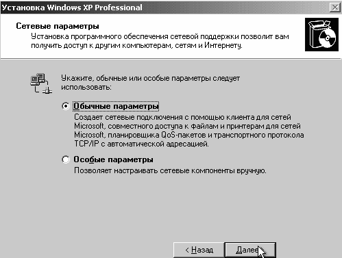 В данном окне рекомендуется выбрать Обычные параметры (в любом случае после установки операционной системы сетевые параметры можно изменить), после чего нажать кнопку Далее.