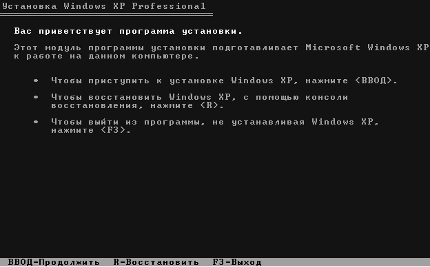 После загрузки необходимых файлов на экране отображается окно, в котором нужно выбрать требуемый режим установки (рис. 1.3). Начиная с этого этапа, дальнейшая установка Windows XP осуществляется с участием пользователя.