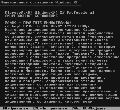 Дальнейшие работы по установке возможны только после принятия данного соглашения, для чего необходимо нажать клавишу F8. Выполнение условий данного лицензионного соглашения обязательно на весь период использования операционной системы.