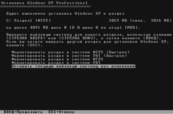 В этом окне осуществляется выбор файловой системы. В данном примере мы выбрали раздел, предварительно отформатированный в системе NTFS (рис. 1.5), поэтому теперь выбираем позицию Оставить текущую файловую систему без изменений (рис. 1.6) и нажимаем Enter. Если же выбран неотформатированный раздел, то данная позиция в списке будет отсутствовать, поэтому нужно будет выбрать файловую систему и нажать клавишу Enter – в результате мастер работы с дисками выполнит форматирование диска в соответствии с выбранной файловой системой.