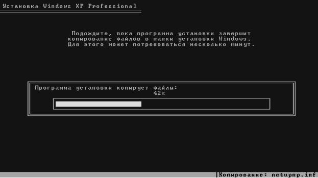 Затем мастер установки Windows XP выполнит ряд необходимых действий (копирование файлов, сохранение параметров и др.), после чего произойдет перезагрузка компьютера.