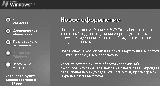 В левой части данного окна приводится перечень этапов, которые необходимо пройти с помощью мастера установки Windows XP в процессе установки системы. В списке выделен текущий этап установки – в данном случае это Установка Windows. Слева внизу окна показывается количество времени, которое осталось до завершения установки (следует учитывать, что это достаточно условная величина – все зависит от конфигурации и аппаратных ресурсов компьютера).