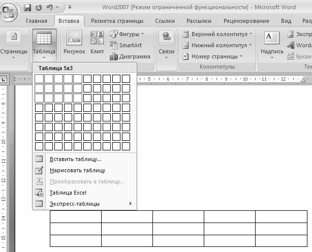 Структура таблицы (количество строк и столбцов) указывается мышью в подменю, открываемом при нажатии кнопки Таблица на вкладке Вставка. На рис. 1.2 видно, что при данном представлении будет нарисована таблица с пятью столбцами и тремя строками; ниже показано, как будет выглядеть таблица в документе. Если отказаться от создания таблицы, то ее изображение исчезнет. Таким образом, можно быстро выбрать наиболее подходящий вариант создания таблицы.
