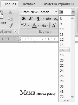 Аналогичным образом можно заранее увидеть, как будет выглядеть слово или текстовый фрагмент, если применить к нему тот или иной стиль (шрифт, размер шрифта, и т. д.). На рис. 1.3 показан фрагмент текста, для первого слова которого «примеряется» шрифт размера 16.