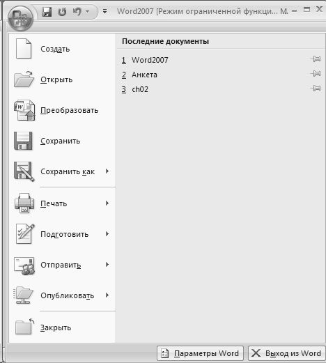 Пользователь, работавший с предыдущими версиями Word, наверняка узнает знакомые команды и подменю, которые он видел ранее в меню Файл. Для тех же, кто только начинает знакомиться с Word, поясним, для чего предназначен каждый элемент меню Office.