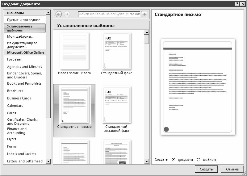 Чтобы создать документ на основе стандартного шаблона, изначально заложенного в Word 2007, следует в левой части окна Создание документа в поле Шаблоны выбрать раздел Установленные шаблоны – в результате в центральной части окна отобразится список имеющихся шаблонов (см. рис. 2.3). В этом списке нужно щелчком мыши выбрать подходящий шаблон и нажать кнопку Создать. Отметим, что так можно создавать как новый документ, так и новый шаблон; требуемый вариант указывается с помощью переключателя, который находится над кнопкой Создать.